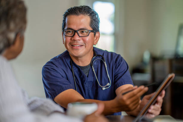 happiness Cheerful elderly woman and men talking with female caregiver nurse doctor having health checking consult at living area,Caretakers with senior couple sitting in living room at nursing home